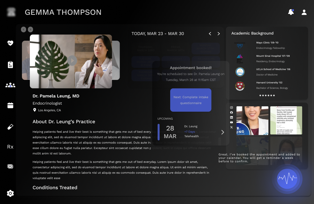 After onboarding the user is taken through the platform’s proprietary clinical intake process which helps to match them with their care team. The user is given a selection of providers to review and then schedules their first telehealth appointment. The platform provides user experience optionality, depending on whether the patient moves through a fully conversational flow with the AI-agent or a more traditional clickable experience.