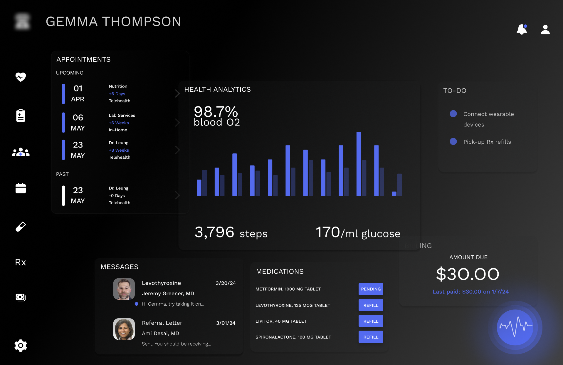 The command center dashboard gives users an at-a-glance view of their daily health to-do’s, biometric progress, messages with their providers, appointments, billing, and current medications. Patients are able to query the AI-agent and pull specific reports or charts which can be pinned to the dashboard for easy monitoring.